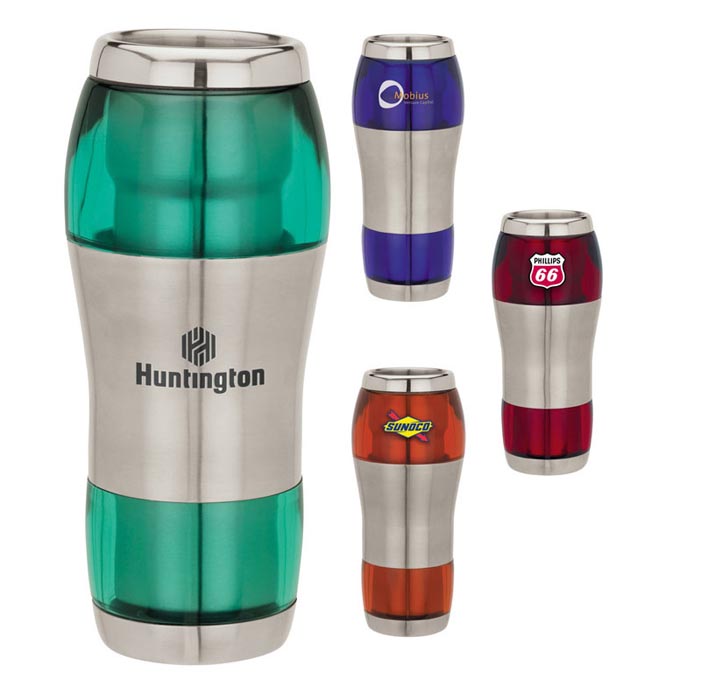 16 oz. Acrylic, Stainless Steel Tumbler: These types of 16 oz. travel mugs feature an ergonomic design, jewel toned plastic, an 18/8 stainless steel interior, rotating lid for easy drinking and non-slip base pad. Have you logo especially placed on either an orange, blue or green accented tumbler.