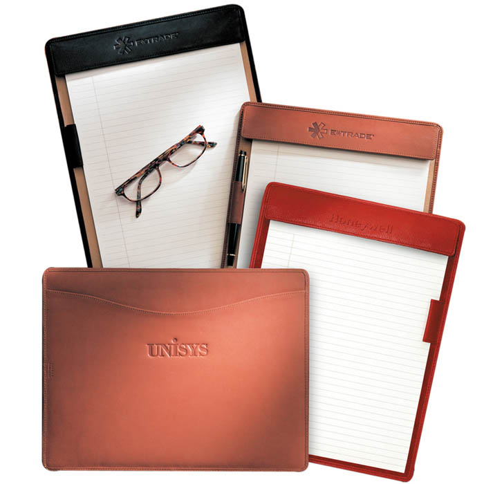 Wall Street Writing Tablet (Large): You will become immersed in your note taking, dictation writing, simple jotting or even doodling. Every executive requires a writing tablet such as this full grain leather gem which finishes complete with a ruled writing pad, luxurious, ultra suede lining and lined back pocket. This gorgeous tablet will exhibit your corporate logo or business name debossed, measuring 9-1/2"w x 12"h overall and is available in colors black, red or tan.