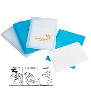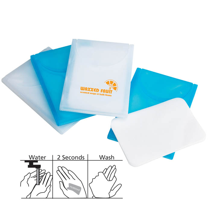 Soap Film And Case: Each case holds 10 soap strips ideally. Measuring 2"w x 2-3/4"h, the cases themselves are available in colors translucent blue or translucent frosted. Instructions are included with your custom imprinted, travel size cases of soap sheets. These films will dissolve in anyone's hand beneath running water into a gentle, cleansing lather.