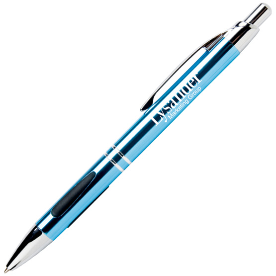 The jewel tones for this sleek pen are available in colors black, navy, champagne, red or light blue. This smooth writing, click action, retractable ballpoint pen's shining metallic barrel will add allure to any personalization. The brilliant chrome accents will also frame and highlight your custom laser engraving even more. This remarkable writing implement features medium, black ink and rubber grip panels for a comfortable writing experience.